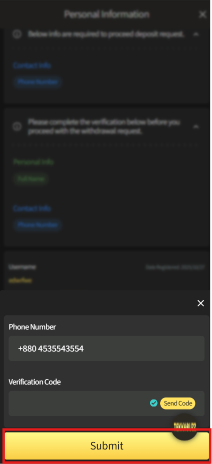 Step 2: Select the “Not verified” button next to your phone number. Click ‘Verify’ and the OTP code will be sent to you via SMS and will expire after 5 minutes. Enter the OTP code in the column and click “Submit”.