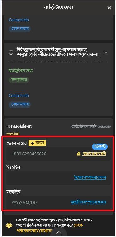 আপনি কোনও টাকা উত্তোলনের অনুরোধ জমা দেওয়ার আগে আপনাকে নিজের ইমেল ঠিকানা, ফোন নম্বর যাচাই করতে হবে এবং আপনার জন্ম তারিখটি আপডেট করতে হবে। আপনার অ্যাকাউন্ট যাচাই করতে,
