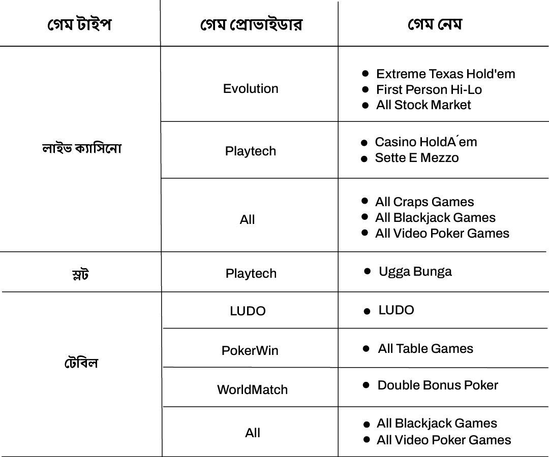 যদিও আমাদের প্ল্যাটফর্মের বেশিরভাগ বেটগুলি ভিআইপি (VIP) পয়েন্ট অর্জনের দিকে গণনা করা হয়, তবে এই নিয়মের ব্যতিক্রম রয়েছে। ভিআইপি (VIP) পয়েন্ট অর্জন থেকে বাদ দেওয়া গেমগুলির বিশদ বিবরণের জন্য, দয়া করে নীচের টেবিলটি দেখুন:
